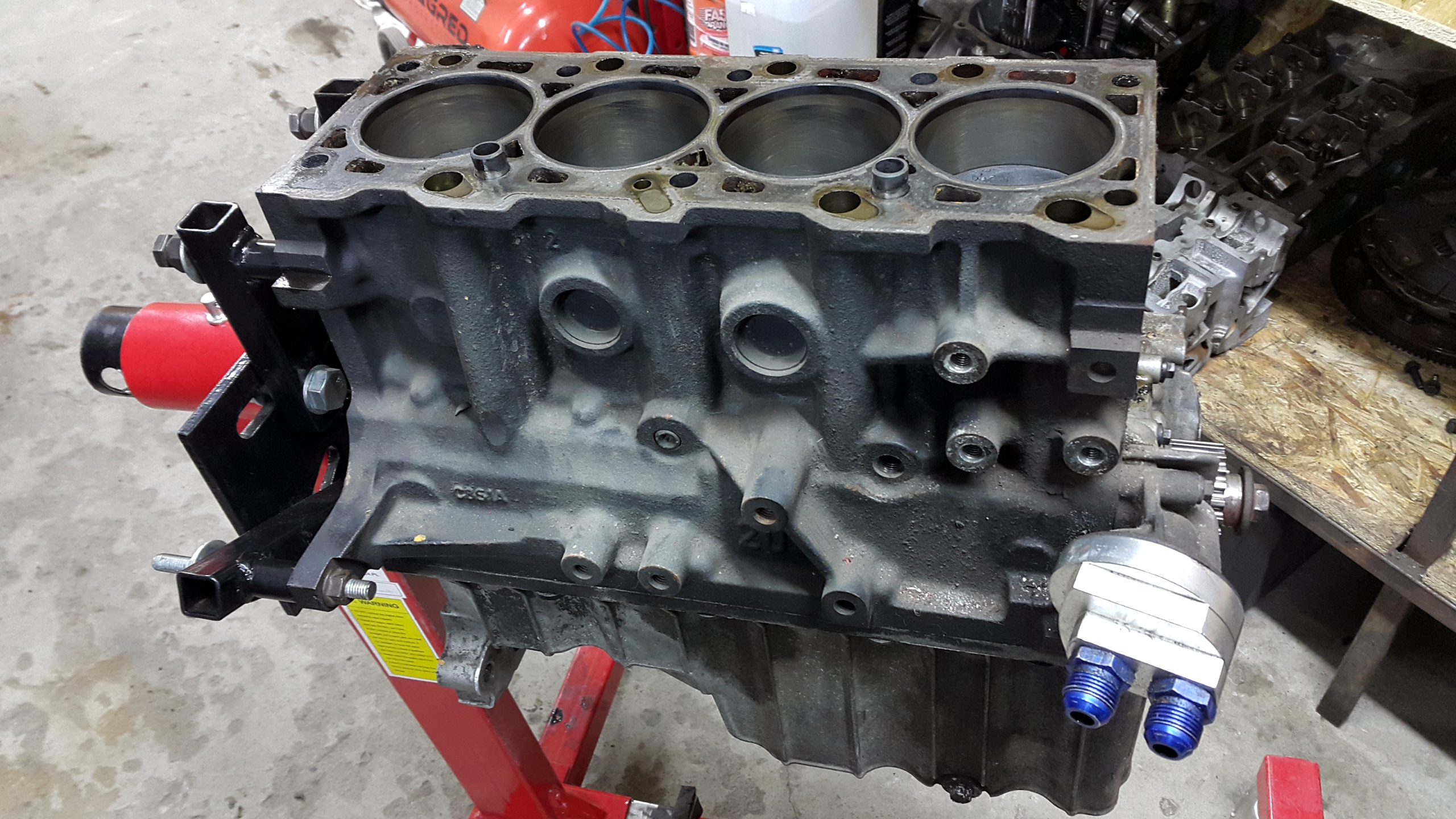 Blok zmodyfikowany pod nowe tłoki, splanowany. Dodatkowo pomiędzy 2 a 3 cylindrem blisko głowicy udało mi się zrobić miejsce na szpilkę M8 pod czujnik stuku lub det can.
